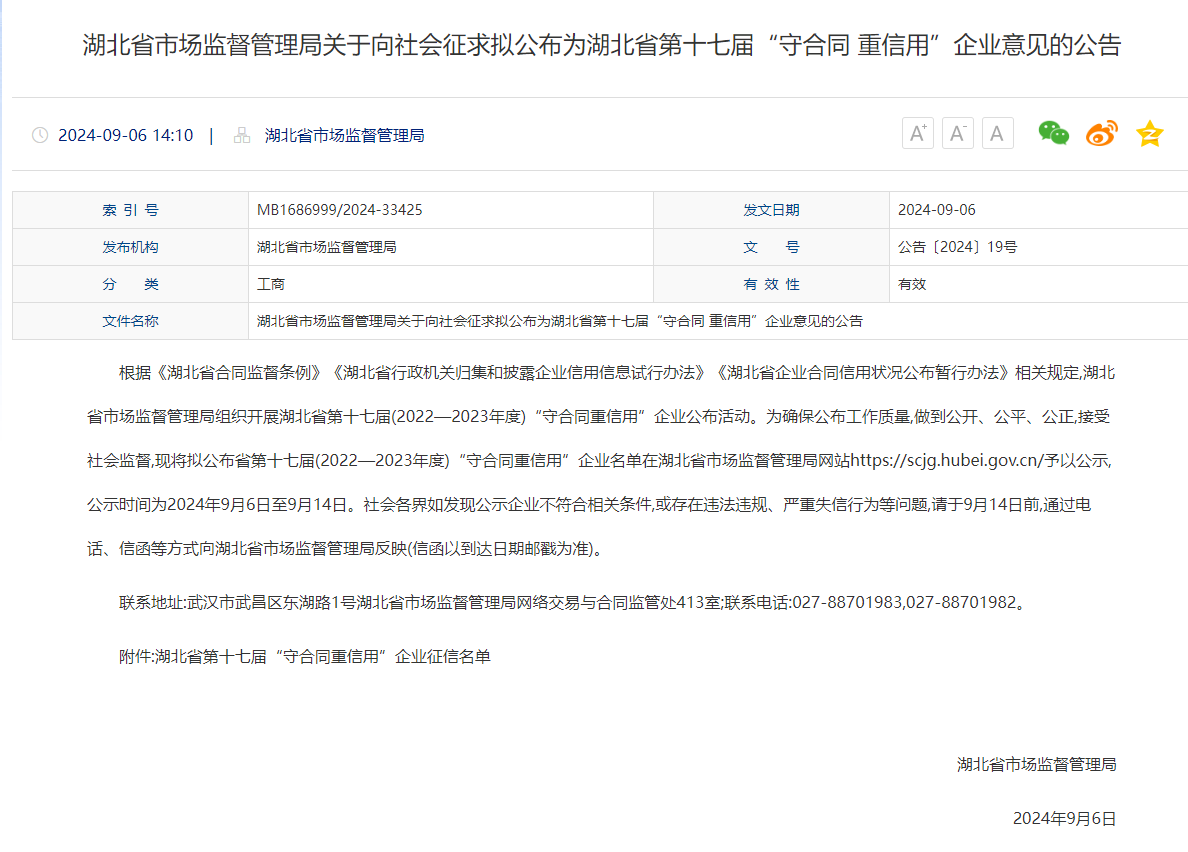 公司下屬子公司湖北省成套造價(jià)咨詢有限公司在此次評(píng)選中榮獲2022—2023年度湖北省和武漢市“守合同重信用”企業(yè)稱號(hào)。湖北省成套工程咨詢有限公司榮獲2022-2023年度武漢市“守合同重信用”企業(yè)稱號(hào)。
