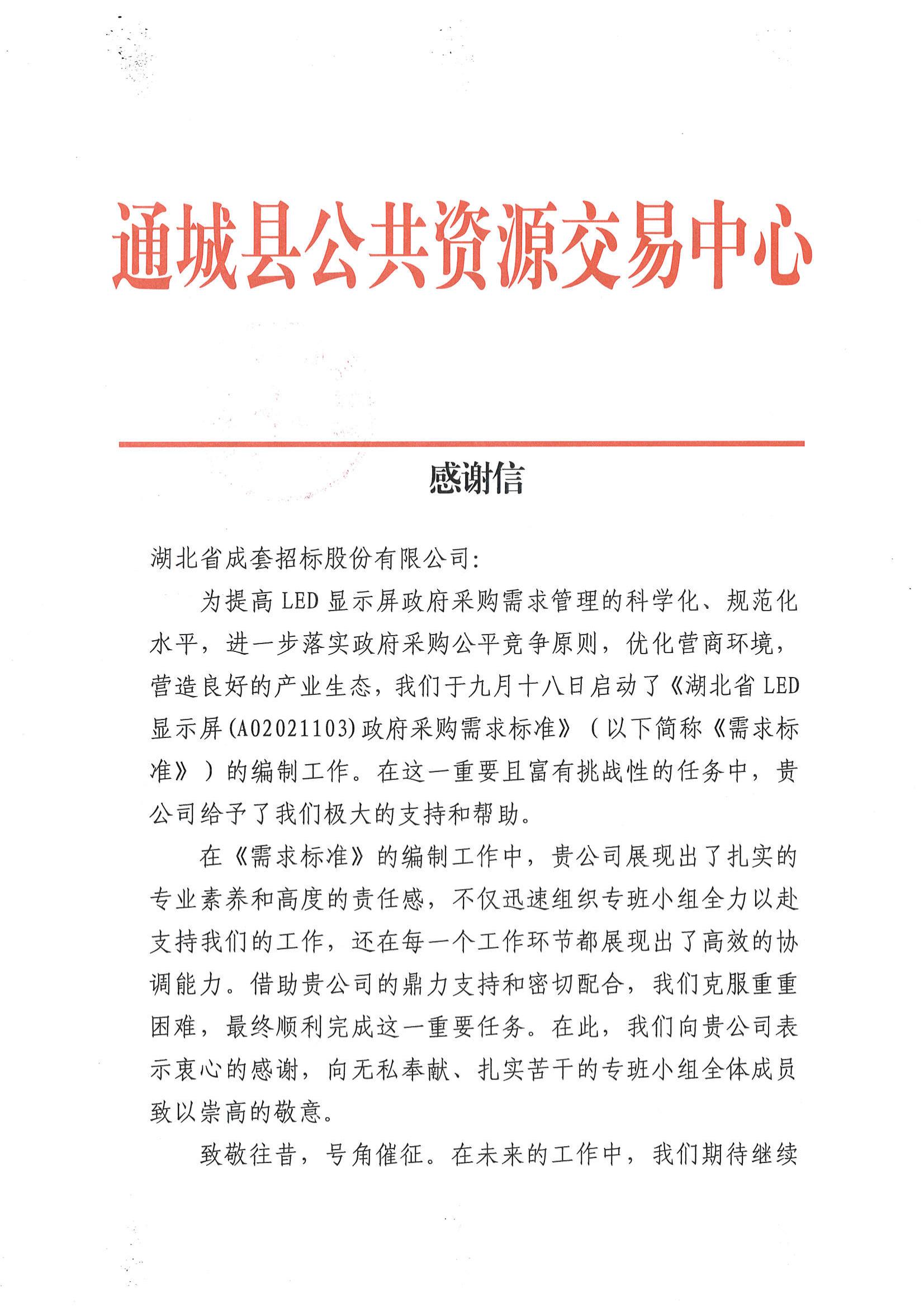 近日,省成套招標(biāo)公司收到來自通城縣公共資源交易中心的感謝信。信中對(duì)公司在《湖北省LED顯示屏(A02021103)政府采購需求標(biāo)準(zhǔn)》(以下簡稱《需求標(biāo)準(zhǔn)》)的編制工作中提供的支持與幫助表示了感謝,并表達(dá)了對(duì)未來繼續(xù)合作,共同為推動(dòng)政府采購工作規(guī)范化、科學(xué)化進(jìn)程貢獻(xiàn)力量的深切期望。